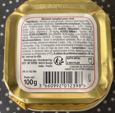 Viandes et sous-produits animaux (dont boeuf 4%)céréalessubstances minérales.